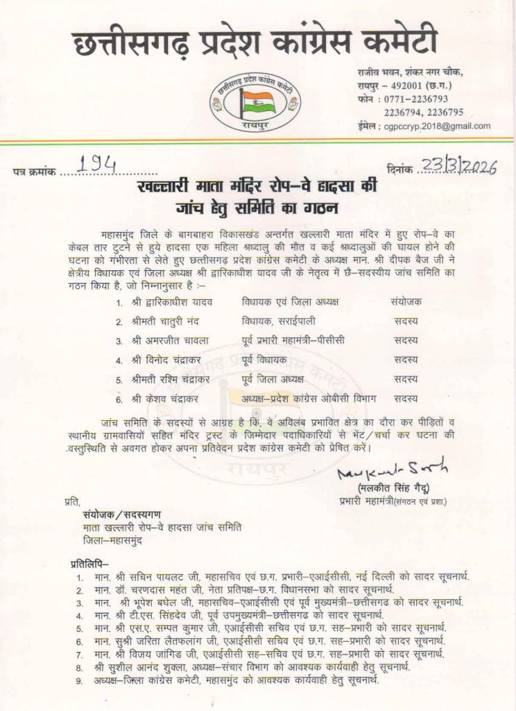 रायपुर. महासमुंद जिले के बागबाहरा स्थित खल्लारी माता मंदिर में हुए रोपवे हादसे की जांच के लिए कांग्रेस ने समिति गठित कर दी है. इस हादसे में एक युवती की मौत हो गई, जबकि 16 लोग हादसे में घायल हुए हैं. पीसीसी चीफ दीपक बैज की जांच समिति ने 6 सदस्यों को शामिल किया गया है. विधायक द्वारिकाधीश यादव को समिति का संयोजक बनाया गया है.
