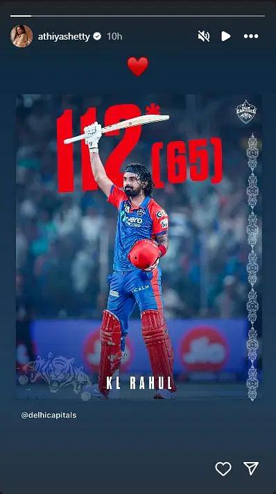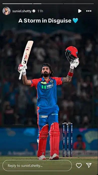 इतिहास रचने पर राहुल की इस उपलब्धि पर ससुर सुनील शेट्टी (Suniel Shetty) और केएल राहुल की पत्नी अथिया शेट्टी (Athiya Shetty) ने राहुल को बधाई दी. एक्ट्रेस ने अपनी इंस्टाग्राम स्टोरी पर दिल्ली कैपिटल्स द्वारा राहुल की तारीफ करते हुए एक पोस्ट के कैप्शन में लिखा “बीस्ट के बल्ले से पांचवां आईपीएल शतक.” इसे फिर से रि-शेयर करते हुए अथिया ने बस एक लाल दिल वाला इमोजी जोड़ा. वहीं अभिनेता सुनील शेट्टी (Suniel Shetty) ने अपनी इंस्टाग्राम स्टोरी पर राहुल की एक फोटो पोस्ट की और लिखा, “एक तूफान. साथ में नीला दिल वाला इमोजी.”
