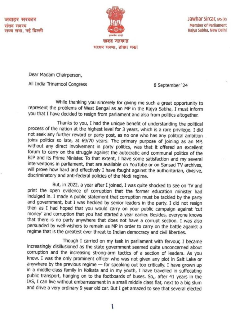 जवाहर सरकार ने अपने पत्र में कहा है कि कोलकाता में हो रहा मौजूदा विरोध प्रदर्शन जिसने बंगाल को झकझोर कर रख दिया है। वह टीएमसी सरकार के ‘कुछ पसंदीदा लोगों और भ्रष्ट लोगों के अनियंत्रित दबंग रवैये’ के खिलाफ जनता के गुस्से का प्रतिबिंब है। सीएम ममता को लिखे अपने पत्र में जवाहर सरकार ने पार्टी में भ्रष्टाचार का भी मुद्दा उठाया। उन्होंने कहा कि पंचायत और नगर पालिकाओं में स्थानीय स्तर के पार्टी नेताओं ने भारी संपत्ति अर्जित की है जिससे बंगाल के लोगों को नुकसान हुआ है।