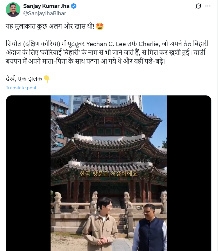 दरअसल, सियोल (दक्षिण कोरिया) में Yechan C. Lee उर्फ Charlie, जो अपने ठेठ बिहारी अंदाज के लिए ‘कोरियाई बिहारी’ के नाम से भी जाने जाते हैं, वह एक यूट्यूबर हैं. यात्रा के दौरान संजय झा की मुलाक़ात चार्ली से हुई और Youtuber से उन्होंने देश दुनिया और आतंकवाद से सम्बंधित कई बातें की. उन्होंने कहा कि चार्ली से मिल कर खुशी हुई. चार्ली बचपन में अपने माता-पिता के साथ पटना आ गए थे और यहीं पले-बढ़े, इसीलिए वह हिंदी के साथ ठेठ बिहारी भी बोलते हैं.