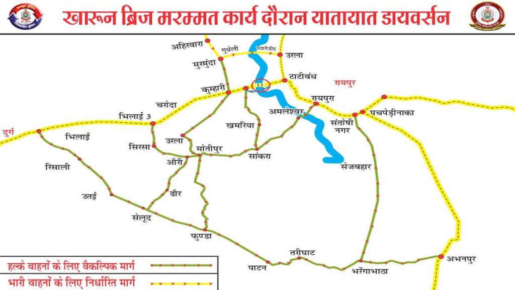 दुर्ग पुलिस के यातायात विभाग की ओर से एक माह तक चलने वाले इस मरम्मत कार्य मे व्यापक डायवर्सन योजना के तहत हल्के, मध्यम और भारी वाहनों के लिए अलग-अलग वैकल्पिक मार्ग तय किए गए हैं. दुर्ग से रायपुर जाने वाले हल्के वाहनों को नेवई-उतई-सेलूद-पाटन- अभनपुर मार्ग और सुपेला-रिसाली क्षेत्र से जाने वालों को उतई-सेलूद-ढौर-अमलेश्वर मार्ग उपयोग करने की सूचना जारी की गई है.