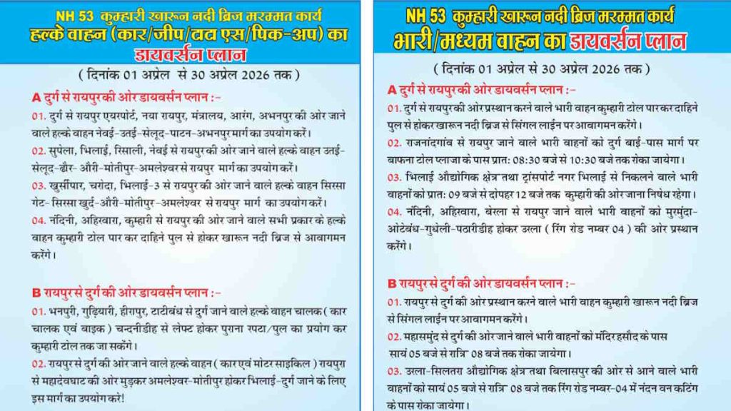 राजनांदगांव और महासमुंद की ओर से आने वाले वाहनों को निर्धारित समय पर टोल प्लाजा और प्रमुख पॉइंट्स पर रोका जाएगा. निर्माण एजेंसी को 24 घंटे वालेंटियर तैनात करने, क्रेन उपलब्ध रखने और डायवर्सन पॉइंट्स पर स्पष्ट संकेतक लगाने के निर्देश दिए गए हैं, साथ ही यातायात पुलिस द्वारा प्रमुख स्थानों पर अतिरिक्त विशेष बल भी तैनात रहेगा.