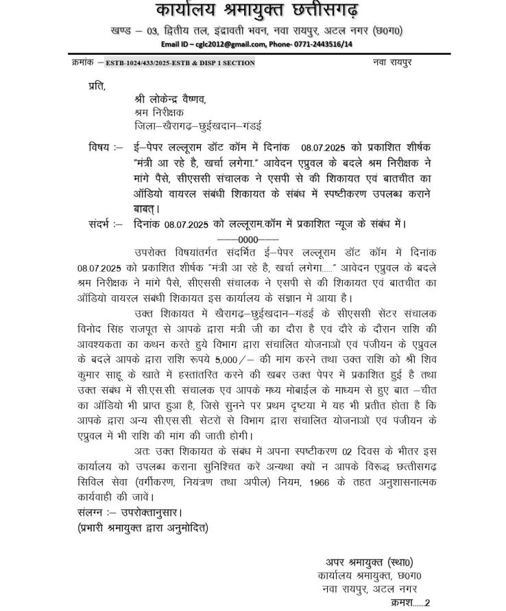 रायपुर। लल्लूराम डॉट कॉम की खबर का एक बार फिर बड़ा असर हुआ है। सीएससी संचालक विनोद सिंह राजपूत की शिकायत और वायरल ऑडियो की खबर के बाद मंत्री लखनलाल देवांगन ने मामले में संज्ञान लिया है, जिसके बाद श्रम विभाग ने श्रम निरीक्षक लोकेन्द्र वैष्णव से दो दिन के भीतर स्पष्टीकरण मांगा है। वहीं समय पर संतोषजनक जवाब नहीं मिलने पर अनुशासनात्मक कार्रवाई की चेतावनी दी गई है।