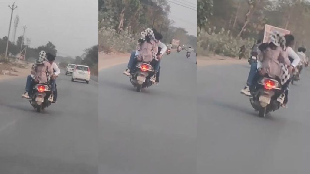 वायरल वीडियो में देखा जा सकता है कि एक मोपेड पर तीन लोग सवार होकर नेशनल हाईवे पर लापरवाही से वाहन चला रहे हैं। इस दौरान युवक-युवतियां सड़क पर रोमांटिक अंदाज में बैठे नजर आ रहे हैं, जिसे लोगों ‘लैला-मजनू’ स्टाइल बता रहे हैं।