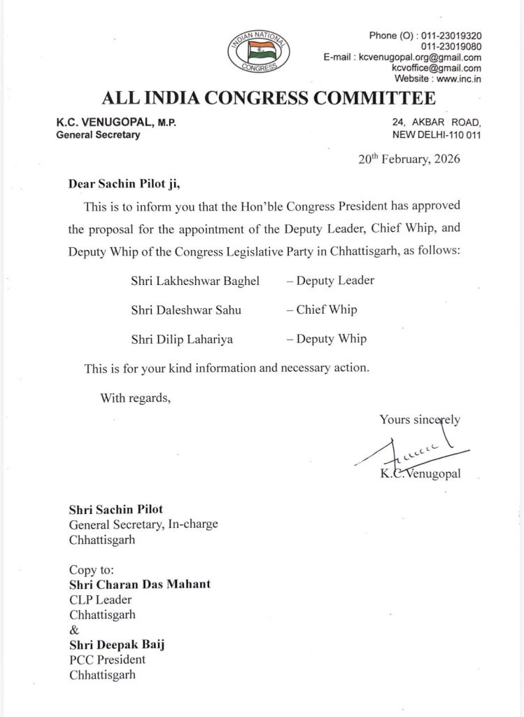 नितिन नामदेव, रायपुर। छत्तीसगढ़ कांग्रेस में अहम नियुक्तियां की है. बस्तर से कांग्रेस विधायक लखेश्वर बघेल को विधानसभा में उप नेता प्रतिपक्ष नियुक्ति किया है. वहीं दलेश्वर साहू को चीफ व्हिप और दिलीप लहरिया डिप्टी व्हिप नियुक्त किया गया है. कांग्रेस अध्यक्ष मल्लिकार्जुन खड़गे की सहमति के बाद ये नियुक्तियां की गई है.