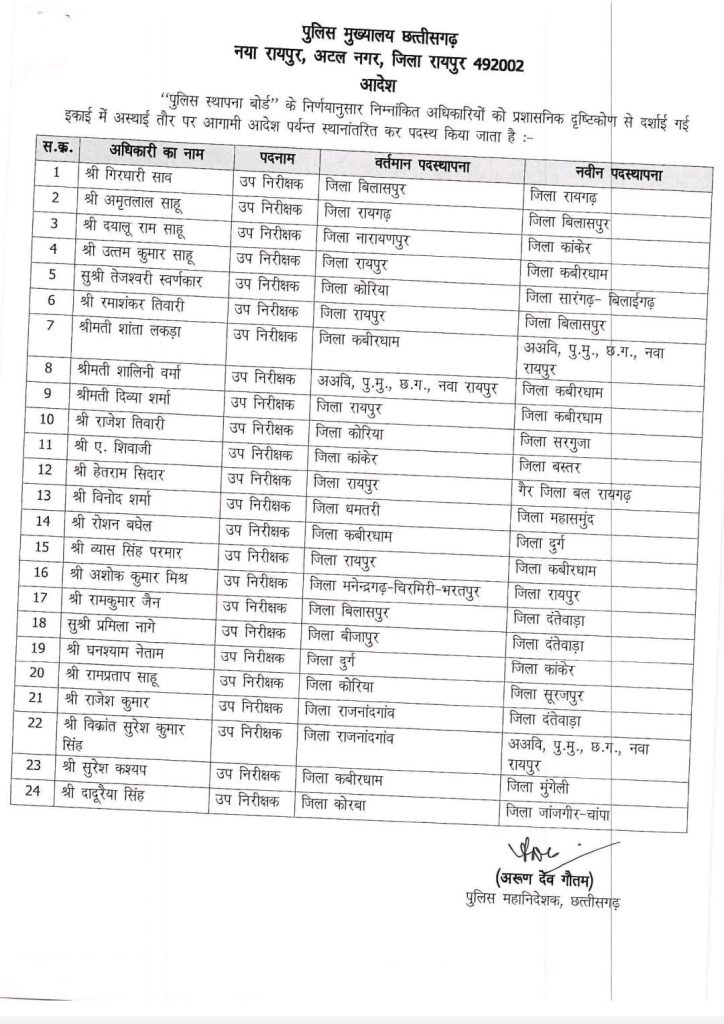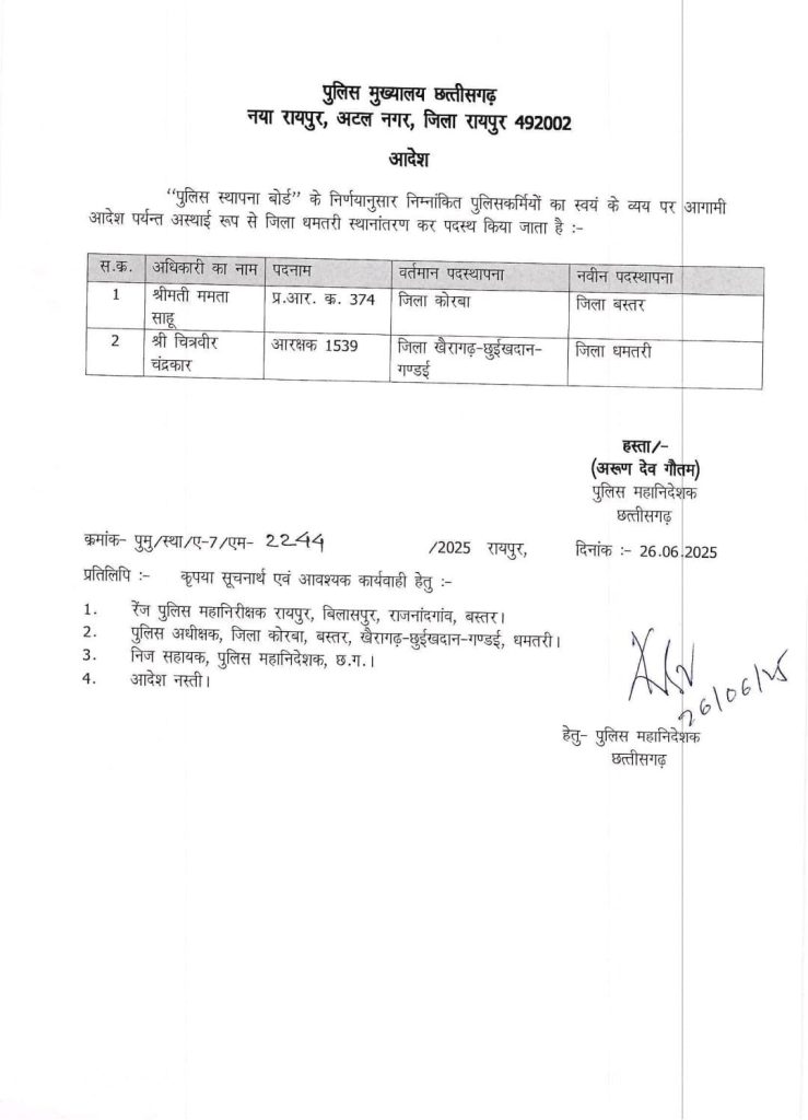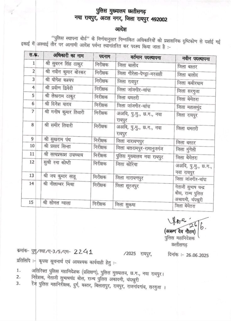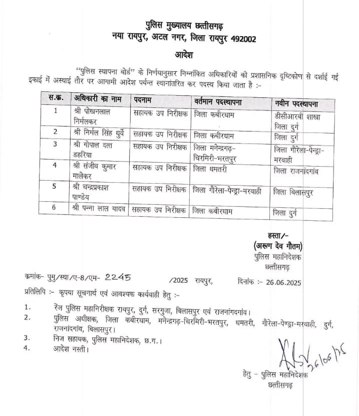 रायपुर। छत्तीसगढ़ पुलिस विभाग में बड़ा प्रशासनिक बदलाव किया गया। पुलिस महानिदेशक अरुण देव गौतम ने थाना प्रभारी, उप निरीक्षक, सहायक उप निरीक्षक, प्रधान आरक्षक समेत आरक्षकों के तबादले का आदेश जारी किया है। राजधानी रायपुर के पुरानी बस्ती थाना के प्रभारी निरीक्षक योगेश कश्यप का तबादला कबीरधाम किया गया है। वहीं, सुकमा में हुए आईईडी विस्फोट में घायल हुए निरीक्षक सोनल ग्वाला को सुकमा से स्थानांतरित कर बेमेतरा भेजा गया है। यह सभी तबादले प्रशासनिक आधार पर किए गए हैं और अगले आदेश तक प्रभावी रहेंगे।