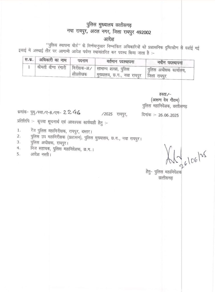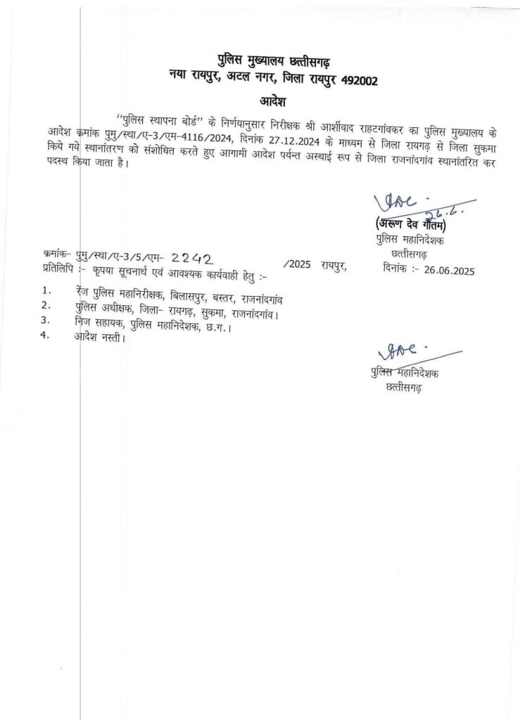पुलिस महानिदेशक अरुण देव गौतम द्वारा जारी संशोधित आदेश के तहत निरीक्षक आशीर्वाद राहटगांवकर के स्थानांतरण में बदलाव किया गया है। पूर्व में जारी आदेश के अनुसार उन्हें जिला रायगढ़ से सुकमा स्थानांतरित किया गया था। हालांकि, नए आदेश के अनुसार अब उनका तबादला संशोधित करते हुए जिला राजनांदगांव में अस्थायी रूप से आगामी आदेश तक किया गया है।