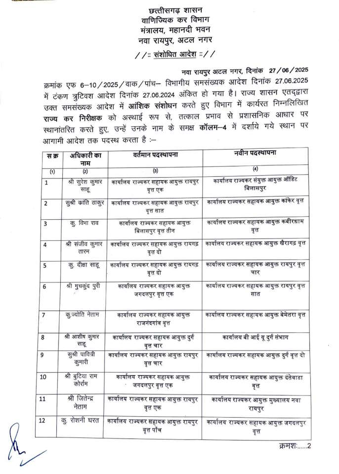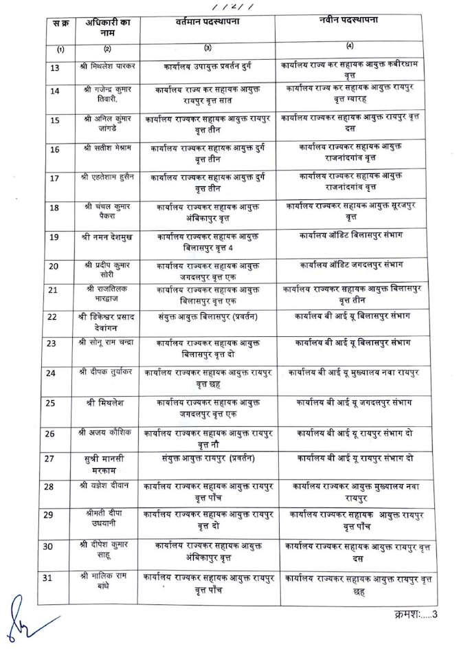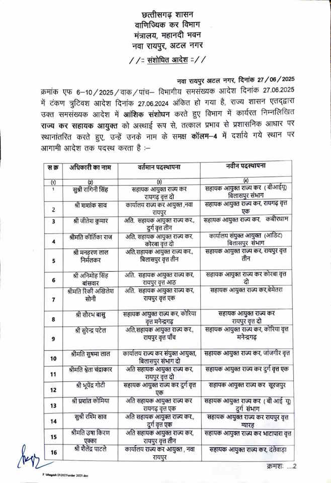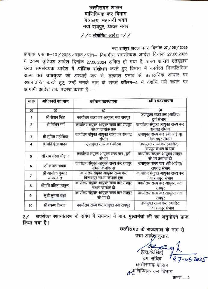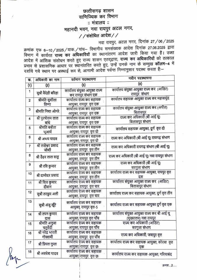जारी आदेश में राज्य कर उपायुक्त के अलावा राज्य कर संयुक्त आयुक्त, राज्य कर सहायक आयुक्त, राज्य कर निरीक्षक एवं राज्य कर अधिकारियों का तबादला किया गया है.