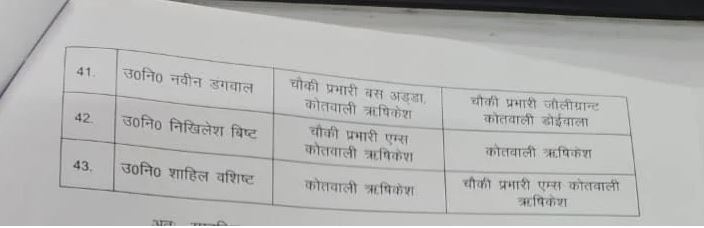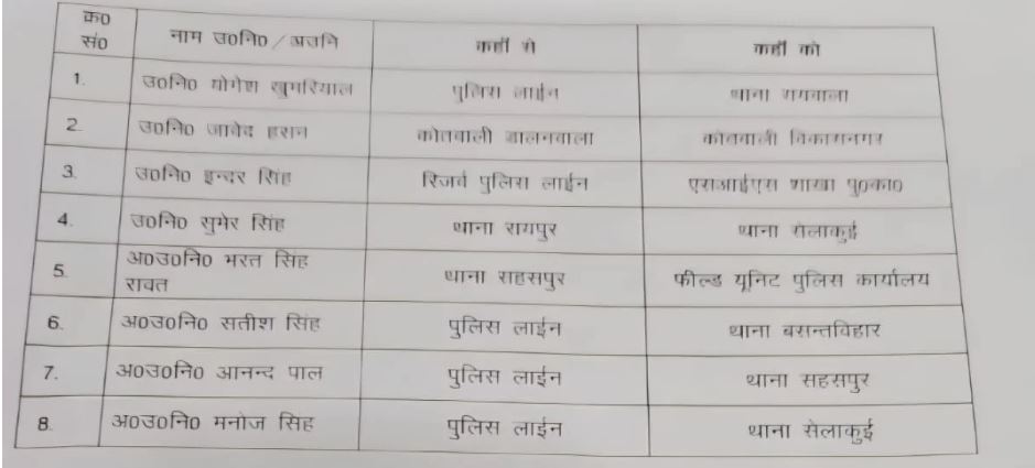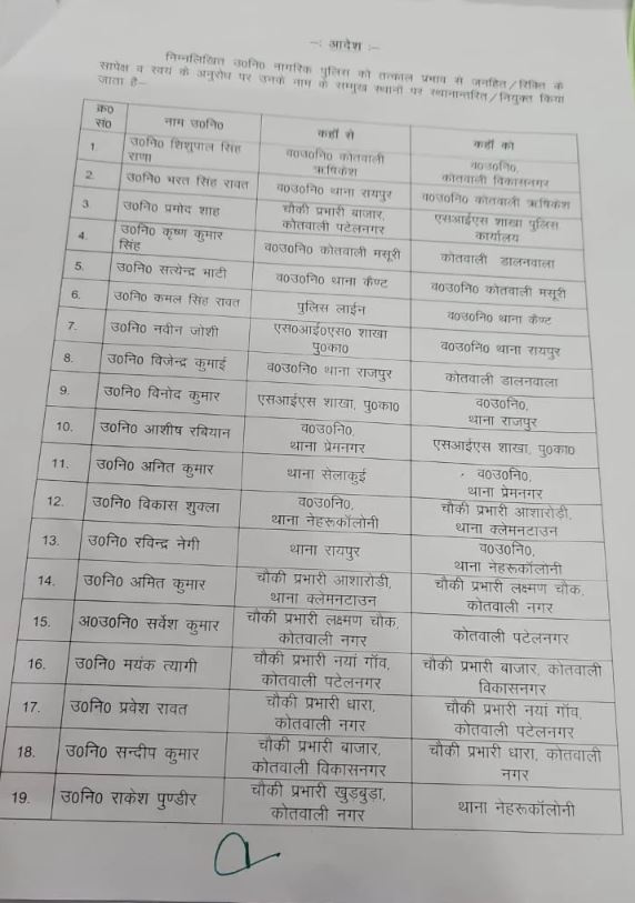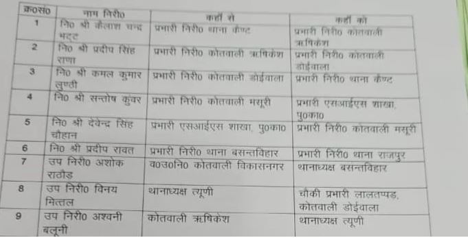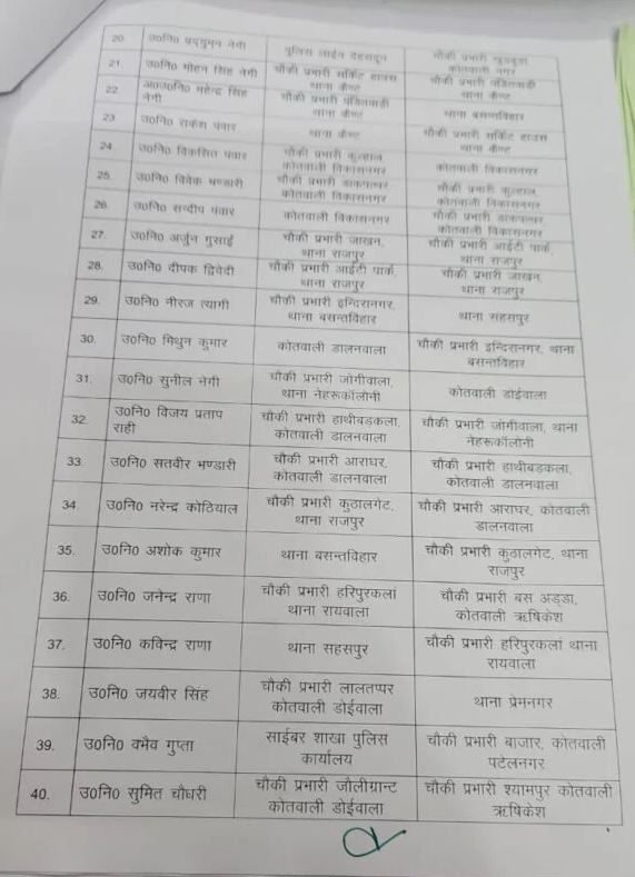 देहरादून. रविवार देर रात बड़े स्तर पर थाना और चौकी प्रभारियों का तबादला किया गया है. एसएसपी देहरादून अजय सिंह ने थाना और चौकी प्रभारियों समेत सब इंस्पेक्टर और इंस्पेक्टर का ट्रांसफर कर दिया. जारी आदेश के अनुसार शहरी और ग्रामीण इलाकों में तैनात चौकी और थाना इंचार्ज बदले गए.