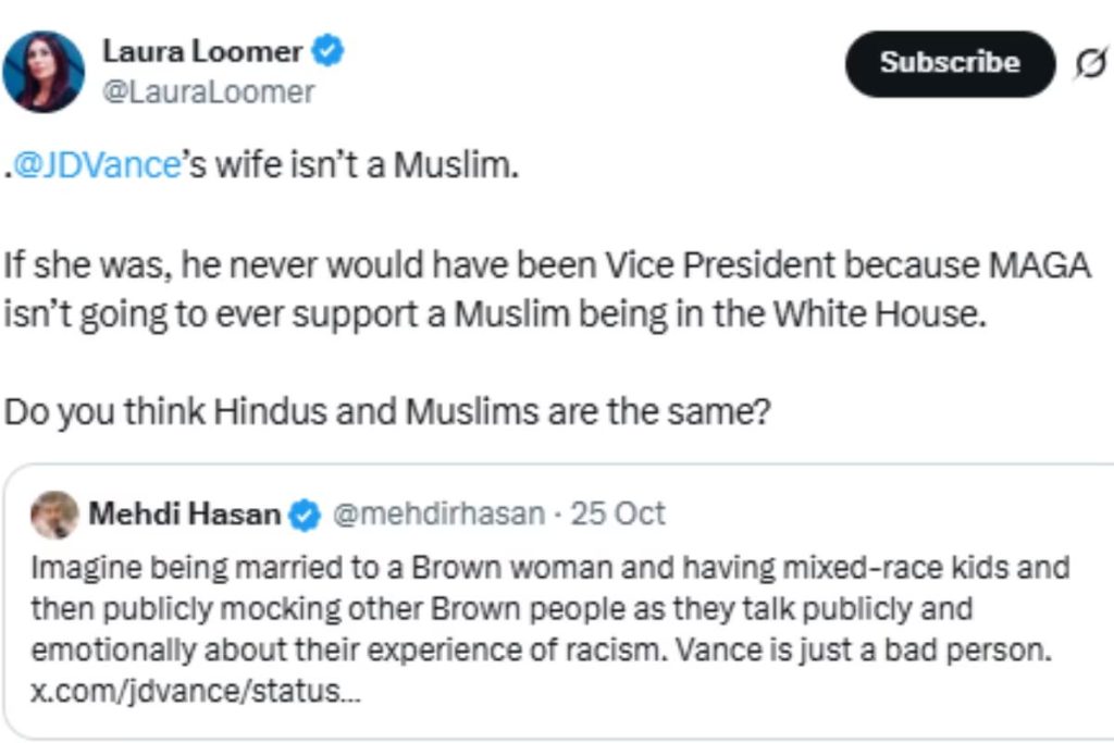 सोशल मीडिया प्लेटफॉर्म एक्स पर एक पोस्ट में लूमर ने लिखा-आपको क्या लगता है कि हिंदू और मुस्लिम एक जैसे होते हैं?’ लूमर ने आगे लिखा, ‘ऊषा वेंस एक हिंदू अमेरिकी हैं। हमें अश्वेत लोगों से नहीं इस्लाम से परेशानी है।