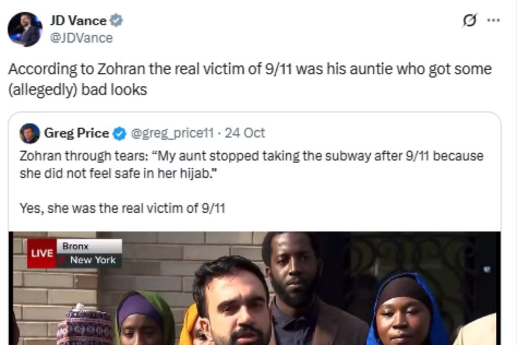जोहरान का यह बयान जेडी वेंस को पसंद नहीं आया और उन्होंने कहा, ‘जोहरान के हिसाब से 9/11 की असली पीड़िता उनकी आंटी हैं। इस पर ब्रिटिश-अमेरिकी पत्रकार मेहदी हसन ने जेडी वेंस को बुरा इंसान कहकर संबोधित किया और उनकी टिप्पणी की आलोचना करते हुए कहा कि आपने खुद एक अश्वेत महिला से शादी की है। आपके बच्चे मिक्स नस्ल के हैं और फिर भी आप पब्लिकली अश्वेत लोगों का मजाक बना रहे हैं। जबकि खुद उन्होंने एक भारतीय हिंदू से शादी की है।