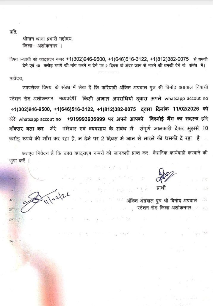 दरअसल एमपी के अशोकनगर के प्रसिद्ध व्यवसायी अंकित अग्रवाल को लॉरेंस विश्नोई गैंग से धमकी मिली है। विश्नोई गैंग के सदस्य हरि बॉक्सर ने यह धमकी दी है। पहले संपत्ति और परिवार की दी जानकारी, फिर धमकी भरे वॉइस मेसेज से 10 करोड़ की फिरौती मांगी है। 2 दिन में फिरौती के रुपये नहीं देने पर जान से मारने की धमकी दी है।