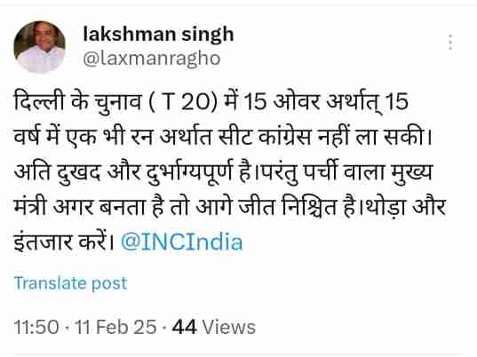 हालांकि, लक्ष्मण सिंह ने इस बार भड़ास निकालने के लिए जो तरीका चुना, वो बेहद अलग था। उन्होंने सोशल मीडिया एक्स प्लेटफॉर्म पर पोस्ट किया, “दिल्ली के चुनाव (T20) में 15 ओवर अर्थात 15 वर्ष में एक भी रन अर्थात सीट कांग्रेस नहीं ला सकी, अति दुखद और दुर्भाग्यपूर्ण। परंतु पर्ची वाला मुख्यमंत्री अगर बनता है तो आगे जीत निश्चित है। थोड़ा और इंतजार करें।”