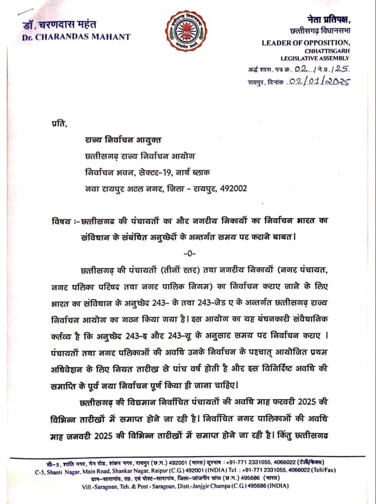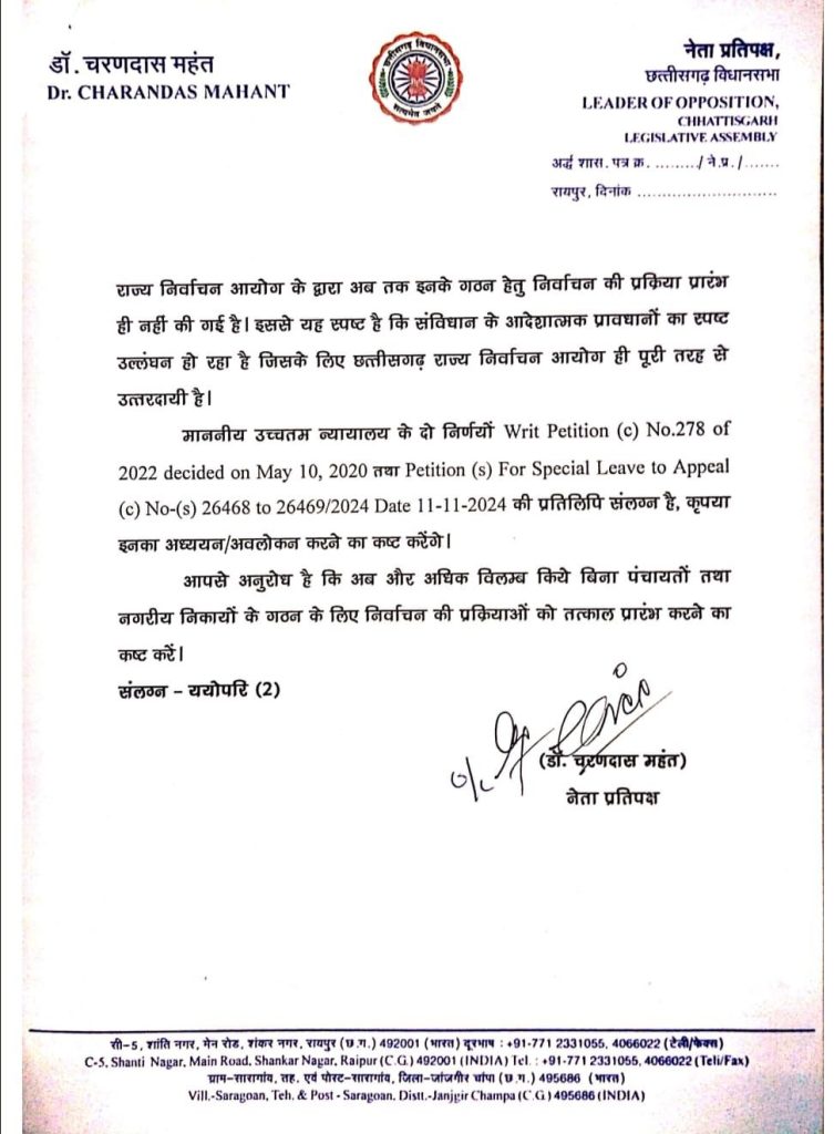 उन्होंने अपने पत्र में लिखा कि छत्तीसगढ़ की पंचायतों (तीनों स्तर) तथा नगरीय निकायों (नगर पंचायत, नगर पलिका परिषद तथा नगर पालिक निगम) का निर्वाचन कराए जाने के लिए भारत का संविधान के अनुच्छेद 243- के तथा 243-जेड ए के अन्तर्गत छत्तीसगढ़ राज्य निर्वाचन आयोग का गठन किया गया है. इस आयोग का यह बंधनकारी संवैधानिक कर्तव्य है कि अनुच्छेद 243-इ और 243-यू के अनुसार समय पर निर्वाचन कराए . पंचायतों तथा नगर पलिकाओं की अवधि उनके निर्वाचन के पश्चात् आयोजित प्रथम अधिवेशन के लिए नियत तारीख से पांच वर्ष होती है और इस विनिर्दिष्ट अवधि की समाप्ति के पूर्व नया निर्वाचन पूर्ण किया ही जाना चाहिए.