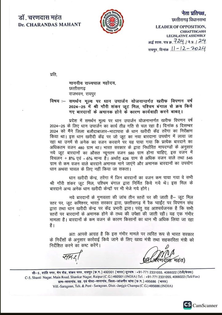 रायपुर। छत्तीसगढ़ विधानसभा के नेता प्रतिपक्ष डॉ. चरणदास महंत ने आज राज्यपाल को पत्र लिखा है. जिसमें उन्होंने खरीफ विपणन वर्ष 2024-25 के लिए क्रय किये गये बारदाने को अमानक बताया है. इस मामले पर नेता प्रतिपक्ष डॉ. महंत ने राज्यपाल को त्वरित रूप से भारत सरकार के निर्देशों के अनुसार कार्यवाही किए जाने के लिए खाद्य मंत्री और सहकारिता मंत्री को निर्देशित करने का आग्रह किया है.