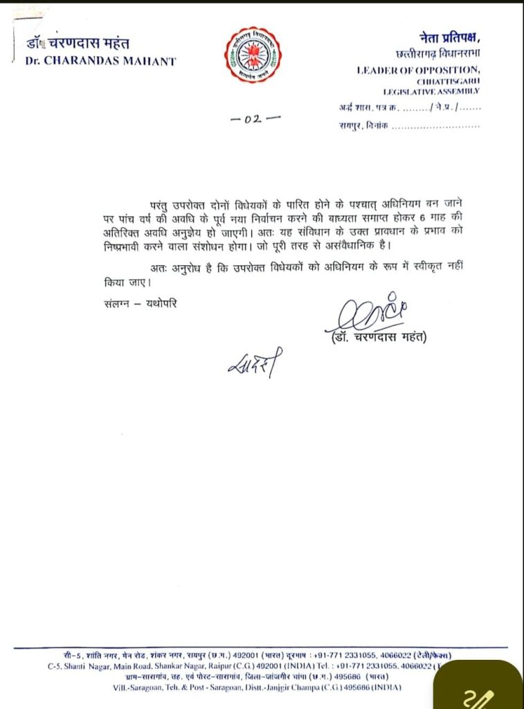 नेता प्रतिपक्ष डॉ. चरणदास महंत ने राज्यपाल रामेन डेका को लिखे पत्र में बताया कि विपक्ष ने इन दोनों विधेयकों पर विचार-विमर्श से पहले ही इन्हें संविधान के प्रावधानों के खिलाफ बताते हुए आपत्ति दर्ज कराई थी। साथ ही, उच्चतम न्यायालय के निर्णय (राइट पिटीशन संख्या 278/2022, 10 मई 2022) का हवाला देते हुए इन विधेयकों को सदन में प्रस्तुत न करने की अपील की थी। बावजूद इसके, विधेयकों को पारित कर दिया गया।