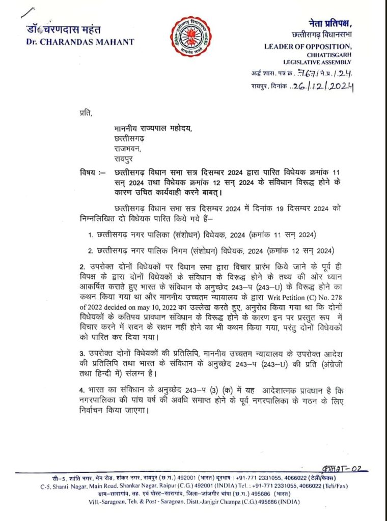रायपुर। छत्तीसगढ़ विधानसभा के नेता प्रतिपक्ष डॉ. चरणदास महंत ने राज्यपाल रामेन डेका को पत्र लिखकर विधानसभा के शीतकालीन सत्र में पारित दो विधेयकों को असंवैधानिक बताया है। उन्होंने राज्यपाल से इन पर उचित कार्रवाई की मांग की है। डॉ. महंत ने पत्र में बताया कि 19 दिसंबर 2024 को विधानसभा में छत्तीसगढ़ नगर पालिका (संशोधन) विधेयक, 2024 (क्रमांक 11) और छत्तीसगढ़ नगर पालिका (संशोधन) विधेयक, 2024 (क्रमांक 12) पारित किए गए। उन्होंने इन विधेयकों को संविधान के अनुच्छेद 243-प (243-यु) का उल्लंघन करार दिया है।