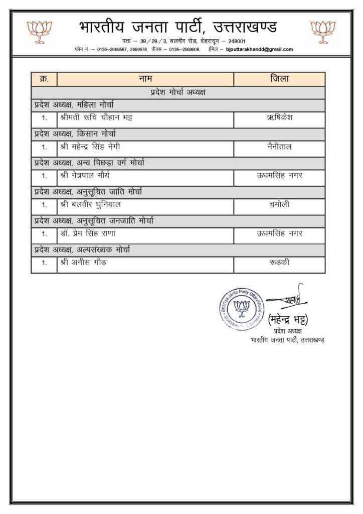 देहरादून. भाजपा उत्तराखंड की नवीन प्रदेश कार्यकारिणी की घोषणा कर दी गई है. जिसमें प्रदेश उपाध्यक्ष, प्रदेश महामंत्री, प्रदेश मंत्री, कोषाध्यक्ष, सह-कोषाध्यक्ष, कार्यालय सचिव, प्रकोष्ठ संयोजक, प्रकोष्ठ सह संयोजक, मुख्य प्रवक्ता, मीडिया संजोयक, मीडिया सह संयोजक, सोशल मीडिया संयोजक, सोशल मीडिया सह संयोजक और आईटी संयोजक की नियुक्ती की गई है.