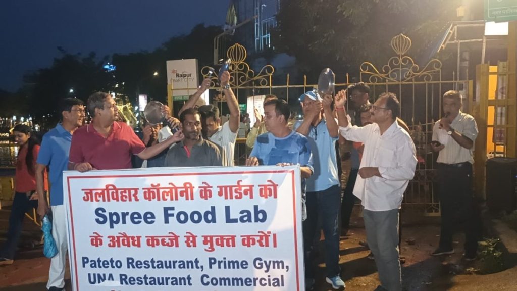 नितिन नामदेव, रायपुर। राजधानी रायपुर का तेलीबांधा तालाब जिसे स्थानीय निवासी मरीन ड्राइव कहते हैं, उसके चारों तरफ पूर्ण व्यवसायी करण हो चुका है. स्प्री फूड लैब्स, स्प्री वॉक और प्राइम जिम, यूएनए रेस्टोरेंट और पार्किंग समेत कई चीजें यहां खुल चुकी है, लगातार बढ़ रहे व्यवसायीकरण को लेकर स्थानीय निवासी अब विरोध पर उतर आए हैं. जलविहार कॉलोनी के स्थानीय निवासियों ने आज रविवार को बढ़ते व्यवसायीकरण और अवैध पार्किंग के खिलाफ चम्मच-थाली बजाकर अपनी नाराजगी जताई और अवैध गतिविधियों पर तुरंत रोक लगाने की मांग की.