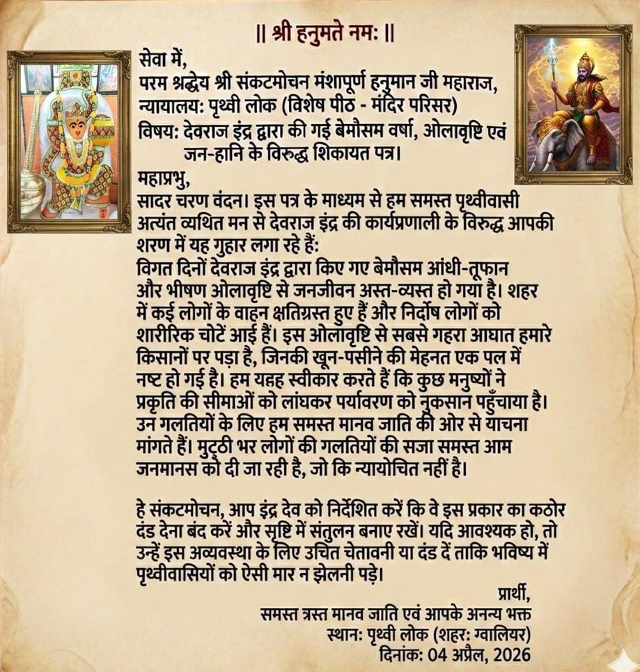 कर्ण मिश्रा, ग्वालियर। मध्य प्रदेश के ग्वालियर चंबल संभाग में आज तेज आंधी बारिश के बाद ओलावृष्टि हुई, बेमौसम हुई ओलावृष्टि और बारिश के चलते लोगों का नुकसान हुआ,जिसके बाद देवराज इंद्र की शिकायत कर कार्रवाई की मांग की गई है। शिकायत पत्र सोशल मीडिया पर वायरल हो रहा है,वहीं शिकायत पत्र के सवाल पर अब आम लोग भी व्यक्तिगत शिकायत करने की बात कर रहे है।