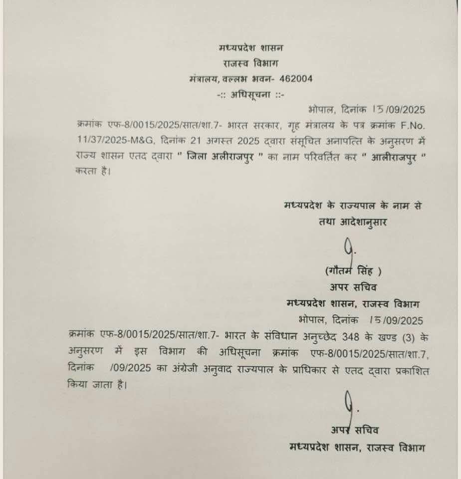 शब्बीर अहमद, भोपाल। Alirajpur District Name Changed: मध्य प्रदेश के अलीराजपुर का नाम बदल गया है। जिले की पहचान अब ‘आलीराजपुर’ के रूप में होगी। राज्य सरकार ने इसकी अधिसूचना जारी कर दी है। यह निर्णय भारत सरकार के गृह मंत्रालय द्वारा 21 अगस्त 2025 को जारी अनापत्ति पत्र के आधार पर लिया गया है।