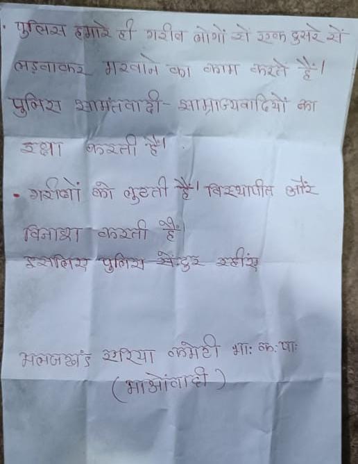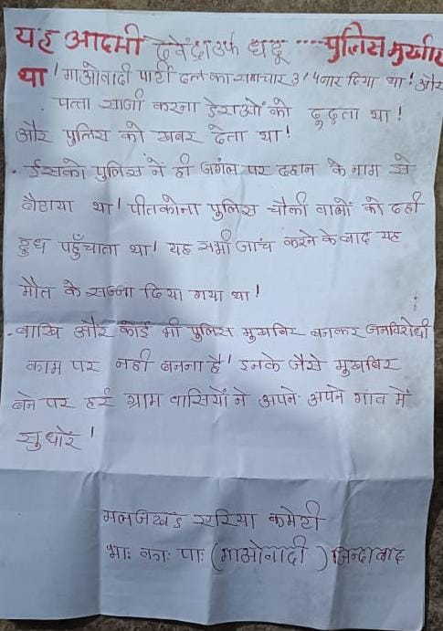 नक्सलियों ने फेंके गए पर्चे में देवेंद्र यादव पर पितकोना पुलिस चौकी में दूध देने के नाम पर पुलिस की मुखबिरी करने का आरोप लगाया है। इसकी जिम्मेदारी मलाजखंड एरिया कमेटी भारतीय कम्युनिस्ट पार्टी माओवादी ने ली है।