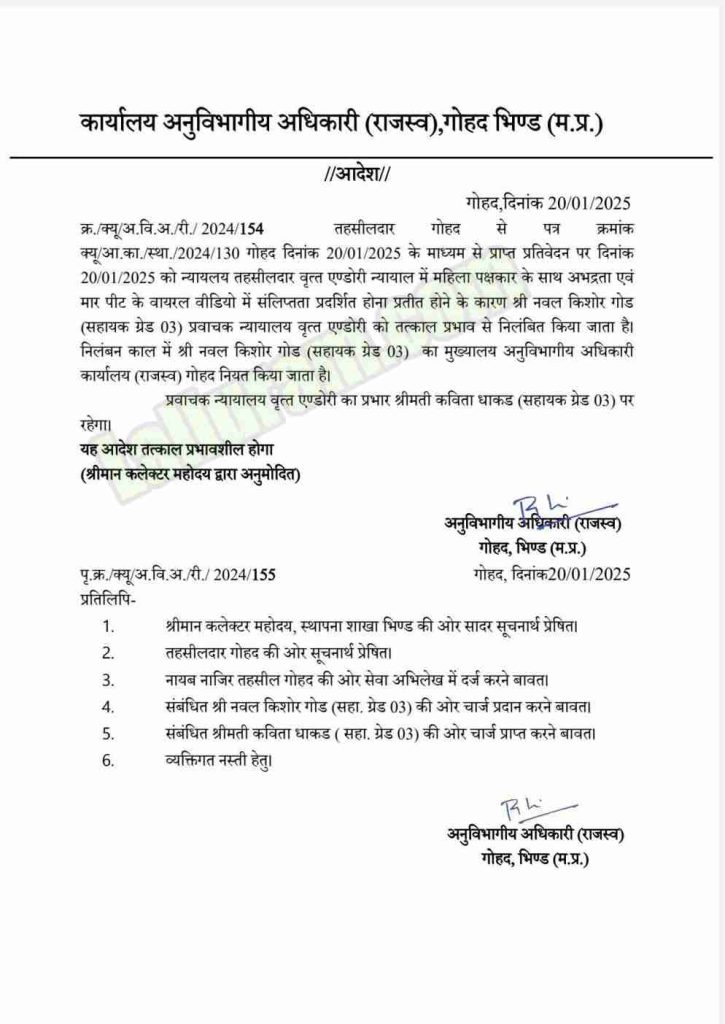 जारी आदेश में लिखा है, “न्यायालय तहसीलदार वृत्त एण्डोरी न्यायाल में महिला पक्षकार के साथ अभद्रता एवं मारपीट के वायरल वीडियो में संलिप्तता प्रदर्शित होना प्रतीत होने के कारण नवल किशोर गोड (सहायक ग्रेड 03) प्रवाचक न्यायालय वृत्त एण्डोरी को तत्काल प्रभाव से निलंचित किया जाता है। निलंबन काल में नवल किशोर गोड (सहायक ग्रेड 03) का मुख्यालय अनुविभागीय अधिकारी कार्यालय (राजस्व) गोहद नियत किया जाता है। प्रवाचक न्यायालय वृत्त एण्डोरी का प्रभार कविता धाकड़ (सहायक ग्रेड (03)पर रहेगा।”