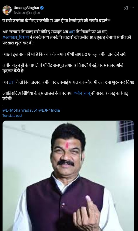 नेता प्रतिपक्ष उमंग सिंघार ने सोशल मीडिया X पर लिखा, “ये मंत्री जनसेवा के लिए राजनीति में आए हैं या रिश्तेदारों की संपत्ति बढ़ाने? MP सरकार के खाद्य मंत्री गोविंद राजपूत अब IT के निशाने पर आ गए। आयकर विभाग ने उनके साथ उनके रिश्तेदारों की करीब 195 एकड़ बेनामी संपत्ति की पड़ताल शुरू कर दी। आश्चर्य इस बात की भी है कि आज के जमाने में भी लोग 50 एकड़ जमीन दान देने लगे। जमीन गड़बड़ी के मामले में गोविंद राजपूत लगातार विवादों में रहे, पर सरकार आंखे मूंदकर बैठी है। अब IT ने तो विवादास्पद जमीन पर उपजाई फसल का ब्यौरा भी तलाशना शुरू कर दिया। ज्योतिरादित्य सिंधिया के इस लाडले नेता पर क्या मौन बाबू की सरकार कोई कार्रवाई करेगी?”