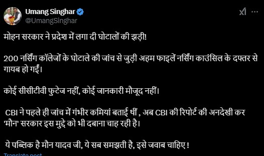 नेता प्रतिपक्ष उमंग सिंघार ने सोशल मीडिया एक्स पर लिखा, “मोहन सरकार ने प्रदेश में लगा दी घोटालों की झड़ी। 200 नर्सिंग कॉलेजों के घोटाले की जांच से जुड़ी अहम फाइलें नर्सिंग काउंसिल के दफ्तर से गायब हो गईं। कोई सीसीटीवी फुटेज नहीं, कोई जानकारी मौजूद नहीं।”