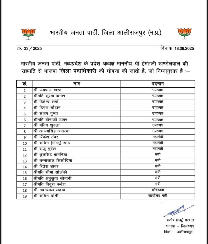 भोपाल। मध्य प्रदेश में बीजेपी जिला पदाधिकारियों की घोषणा की गई है। भारतीय जनता पार्टी ने आलीराजपुर जिले के जिला पदाधिकारियों का ऐलान किया हैं। देर रात यह सूची जारी की गई है। जिसमें 19 कार्यकर्ताओं को जगह मिली है।