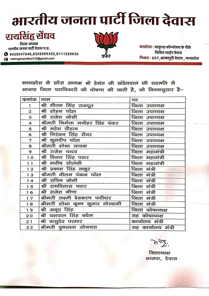 देवास में 22 पदाधिकारियों को जिम्मेदारियां दी गई है। जिसमें 8 जिला उपाध्यक्ष, 3 जिला महामंत्री, 7 जिला मंत्री, 1 जिला कोषाध्यक्ष, 1 सह कोषाध्यक्ष, 1 कार्यालय मंत्री और 1 सह कार्यालय मंत्री की घोषणा की गई है।
