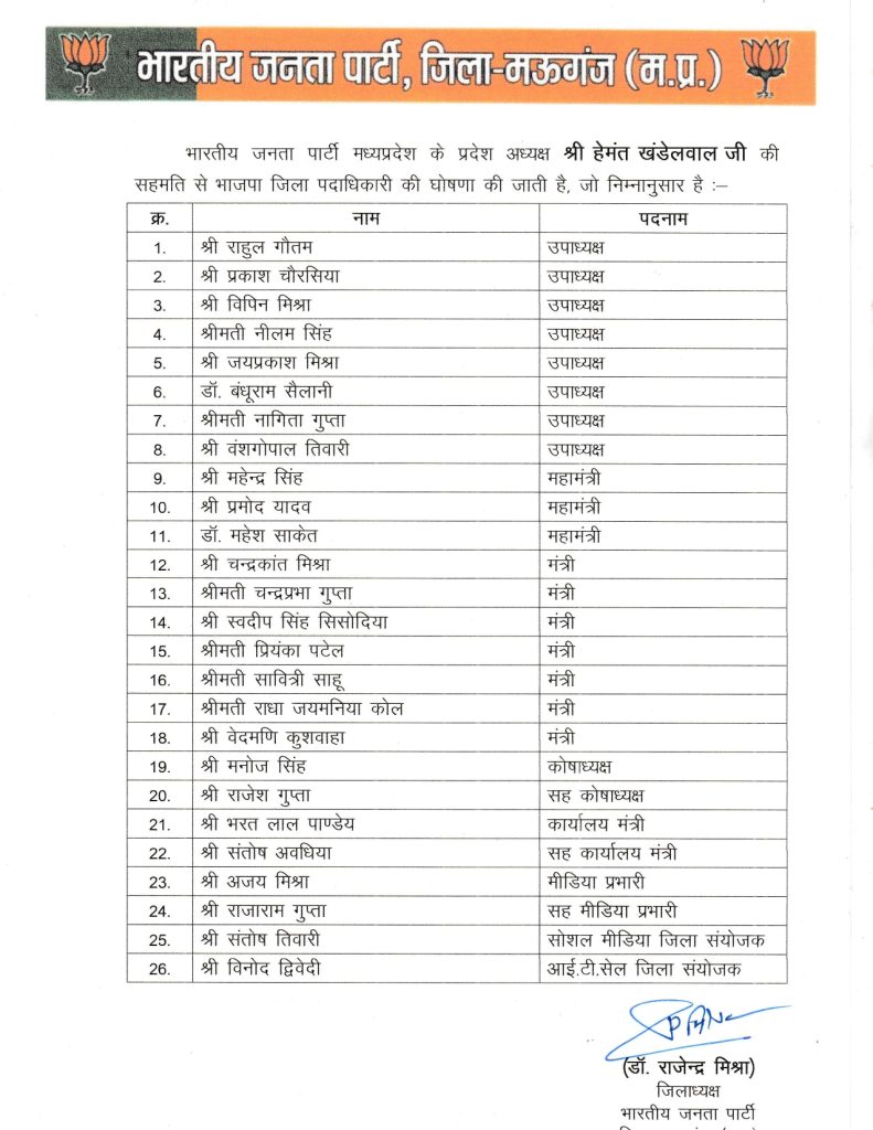 इसी तरह मऊगंज में 26 पदाधिकारियों का ऐलान किया गया है। जिसमें 8 उपाध्यक्ष, 3 महामंत्री, 7 मंत्री, 1 कोषाध्यक्ष, 1 सह कोषाध्यक्ष, 1 कार्यालय मंत्री, 1 सह कार्यालय मंत्री, 1 मीडिया प्रभारी, 1 सह मीडिया प्रभारी, 1सोशल मीडिया जिला संयोजक और 1 आईटी सेल जिला संयोजक का प्रभार सौंपा गया है।