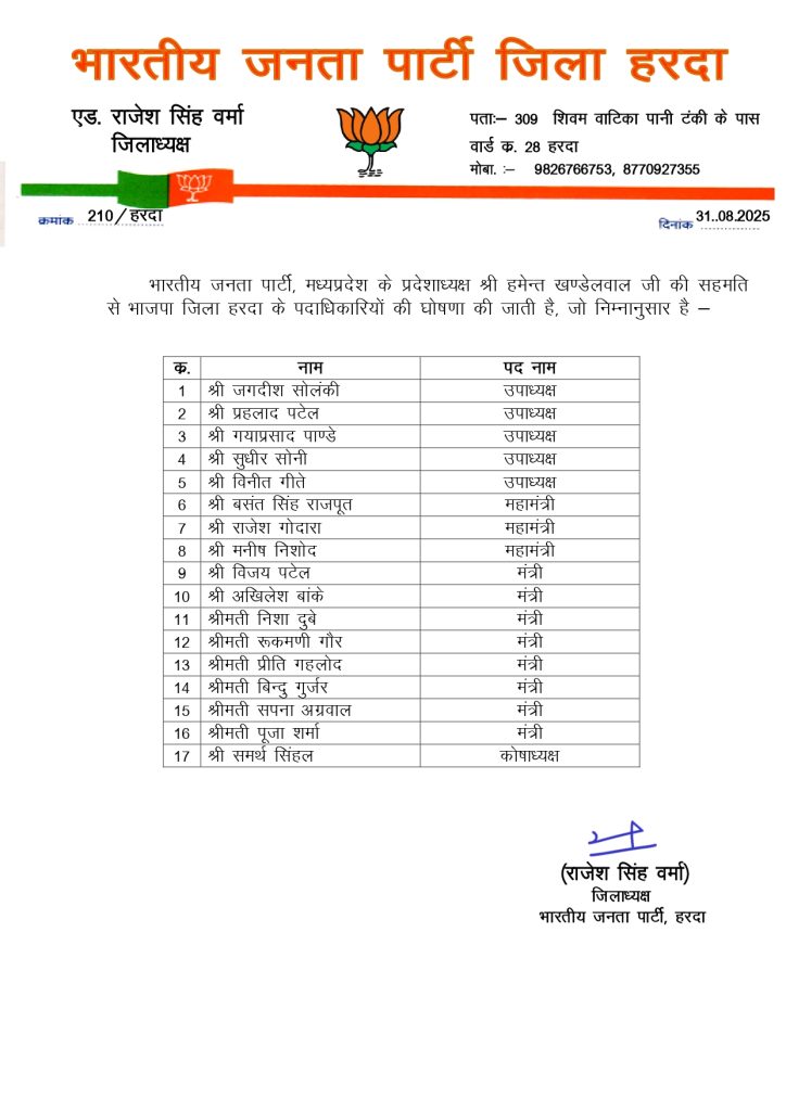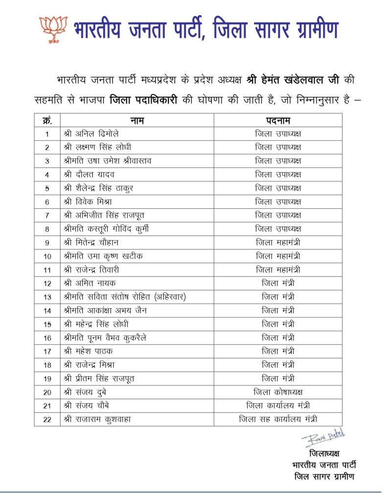 हरदा में कुल 17 पदाधिकारियों की घोषणा हुई है। जिसमें 5 उपाध्यक्ष, 3 महामंत्री, 8 मंत्री सहित कोषाध्यक्ष की घोषणा हुई है। वहीं सागर ग्रामीण में 22 पदाधिकारियों के नाम का ऐलान कर दिया गया है।