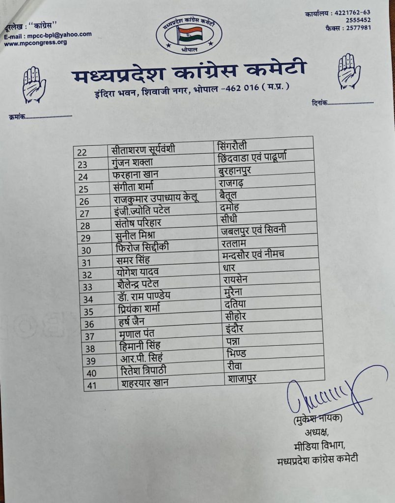 वहीं मिथुन अहिरवार को भोपाल, रवि सक्सेना को ग्वालियर, संतो सिंह गौतम को उज्जैन, स्पर्स चौधरी को नरसिंहपुर, विवेक त्रिपाठी को हरदा, विनय सक्सेना को सतना, डॉ अशोक मार्सकोले को शहडोल व अनूपपुर, रवि वर्मा को अशोकनगर, धर्मेंद्र शर्मा को गुना, नीलाभ शुक्ला को खंडवा और प्रदीप अहिरवार को मंडला जिले का मीडिया प्रभारी बनाया गया है।