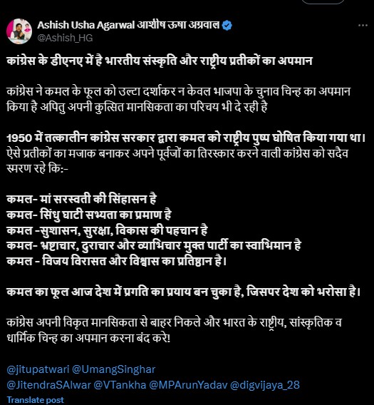 बीजेपी मीडिया प्रभारी आशीष अग्रवाल ने X पर लिखा, “कांग्रेस के डीएनए में है भारतीय संस्कृति और राष्ट्रीय प्रतीकों का अपमान। कांग्रेस ने कमल के फूल को उल्टा दर्शाकर न केवल भाजपा के चुनाव चिन्ह का अपमान किया है, अपितु अपनी कुत्सित मानसिकता का परिचय भी दे रही है।