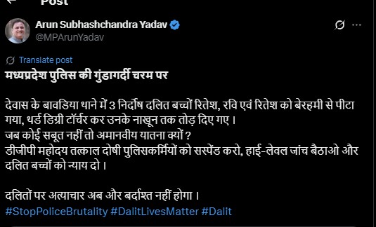 अरुण यादव ने लिखा, ‘मध्यप्रदेश पुलिस की गुंडागर्दी चरम पर। देवास के बावडिया थाने में 3 निर्दोष दलित युवकों रितेश, रवि एवं रितेश को बेरहमी से पीटा गया। थर्ड डिग्री टॉर्चर कर उनके नाखून तक तोड़ दिए गए। जब कोई सबूत नहीं तो अमानवीय यातना क्यों? डीजीपी महोदय तत्काल दोषी पुलिसकर्मियों को सस्पेंड करो, हाई-लेवल जांच बैठाओ और दलित बच्चों को न्याय दो। दलितों पर अत्याचार अब और बर्दाश्त नहीं होगा।’