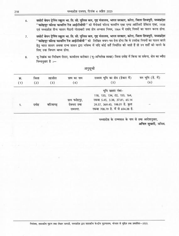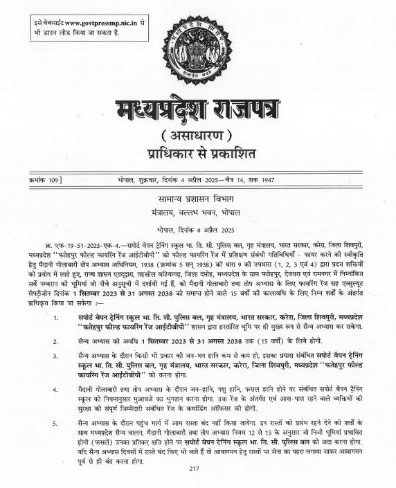 मध्यप्रदेश सरकार ने आईटीबीपी को शिवपुरी के फतेहपुर इलाके में फायरिंग रेंज के लिए जमीन दी है। इस संबंध में सामान्य प्रशासन विभाग ने आदेश जारी कर दिया है। आदेश में कहा गया है कि, सपोर्ट वेपन ट्रेनिंग स्कूल भा. ति. सी. पुलिस बल, गृह मंत्रालय, भारत सरकार, करेरा, जिला शिवपुरी, मध्यप्रदेश ” फतेहपुर फील्ड फायरिंग रेंज आईटीबीपी” शासन द्वारा हस्तांरित भूमि पर ही मुख्य रूप से सैन्य अभ्यास कर सकेगा। सैन्य अभ्यास की अवधि 1 सिंतबर 2023 से 31 अगस्त 2038 तक (15 वर्षों) के लिये होगी।