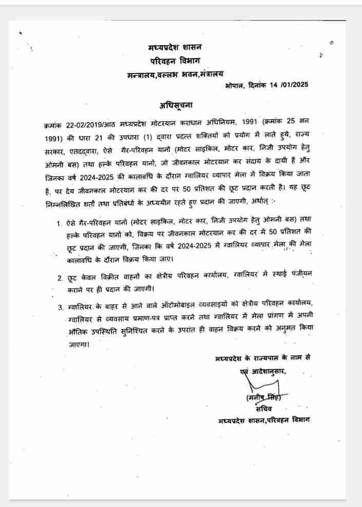 परिवहन विभाग के आदेश के मुताबिक, “मध्यप्रदेश मोटरयान कराधान अधिनियम, 1991 की शक्तियों को प्रयोग में लाते हुए मोटर साइकिल, मोटर कार, निजी उपयोग करने वाले ओमिनी बस और हल्के परिवहन वाहन जो ग्वालियर व्यापार मेला में विक्रय किया जाता है, पर देय जीवनकाल मोटरयान कर की दर पर 50 प्रतिशत की छूट प्रदान करती है।”