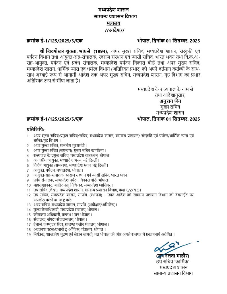 शब्बीर अहमद, भोपाल। IAS शिव शेखर शुक्ला गृह विभाग के मुखिया बनाए गए हैं। शासन ने उन्हें उनके दायित्वों के साथ इसका अतिरिक्त प्रभार सौंपा है। इसे लेकर सामान्य प्रशासन विभाग की ओर से आदेश जारी कर दिया गया है।