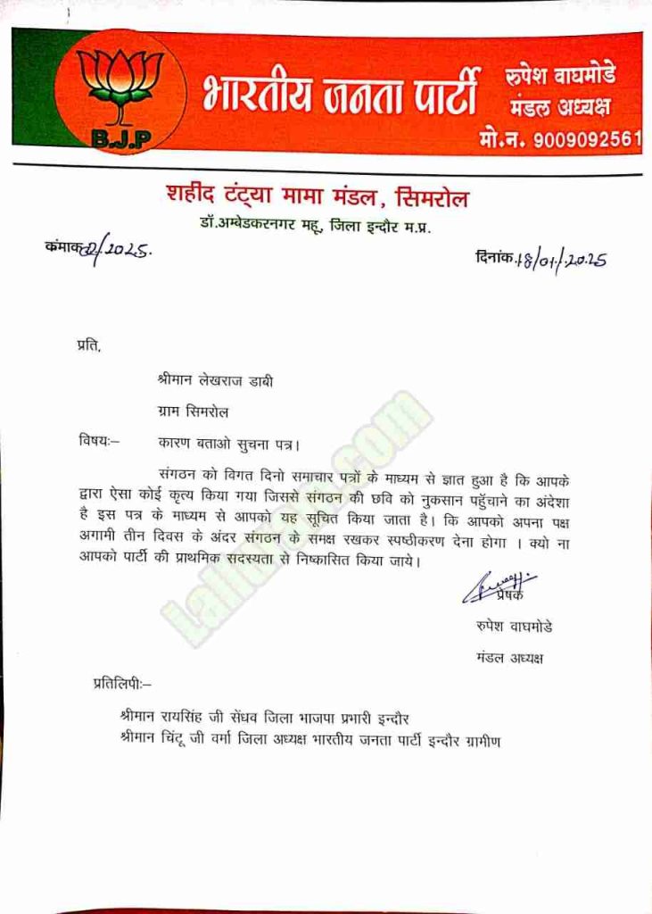 हेमंत शर्मा, इंदौर। मध्य प्रदेश के इंदौर में भाजपा नेत्री से दुष्कर्म के आरोप में घिरे सरपंच पति लेखराज डाबी को भाजपा ने कारण बताओ नोटिस जारी कर दिया। शहीद टंट्या मामा मंडल, सिमरोल ने डाबी को कारण बताओ नोटिस जारी कर तीन दिनों के भीतर जवाब मांगा है। नोटिस में साफ कहा गया है कि उनके कथित कृत्यों से पार्टी की छवि को नुकसान पहुंचने की आशंका है। बता दें कि लल्लूराम डॉट कॉम अय्याश सरपंच पति की काली करतूत उजागर कर रहा था। जिसके बाद पार्टी ने यह बड़ी कार्रवाई की है।