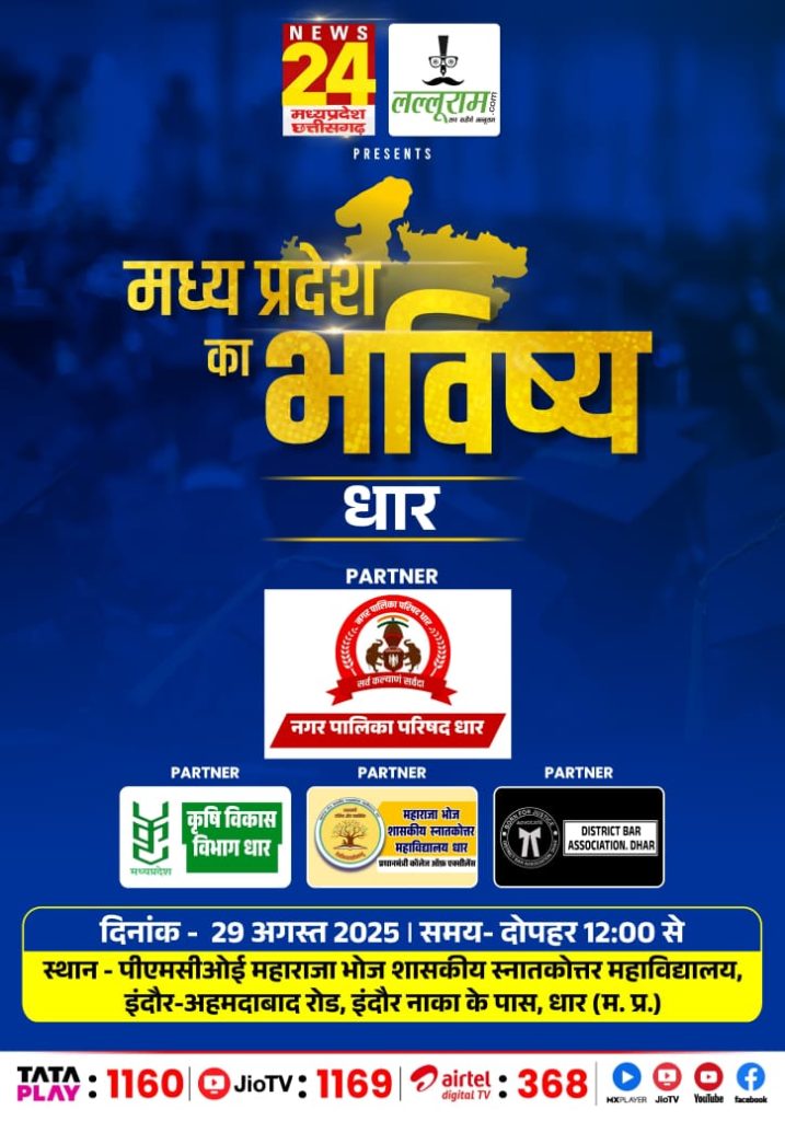 भोपाल/धार। मध्य प्रदेश और छत्तीसगढ़ का सबसे भरोसेमंद चैनल न्यूज 24 मध्य प्रदेश-छत्तीसगढ़ (News24 MP-CG) और लल्लूराम डॉट कॉम (Lalluram.com) धार जिले में 29 अगस्त 2025, दिन शुक्रवार को एक खास कार्यक्रम ‘मध्य प्रदेश का भविष्य धार’ का आयोजन करने जा रहा है।