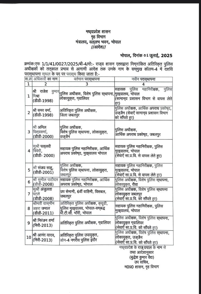 वहीं सुनील पाटीदार एआईजी ईओडब्ल्यू भोपाल को एसपी लोकायुक्त रीवा, अंजुलता पटले उपसेनानी छठवीं वाहिनी एसएएफ जबलपुर को एसपी लोकायुक्त जबलपुर, यास्मीन जहरा जमाल एएसपी क्यूडी पुलिस मुख्यालय पीटीसी भौंरी को एआईजी पीएचक्यू, निरंजन शर्मा एएसपी ग्वालियर को एसपी लोकायुक्त ग्वालियर तथा आनंद यादव एएसपी उपायुक्त जोन 4 नगरीय पुलिस इंदौर को एसपी लोकायुक्त उज्जैन पदस्थ किया है।