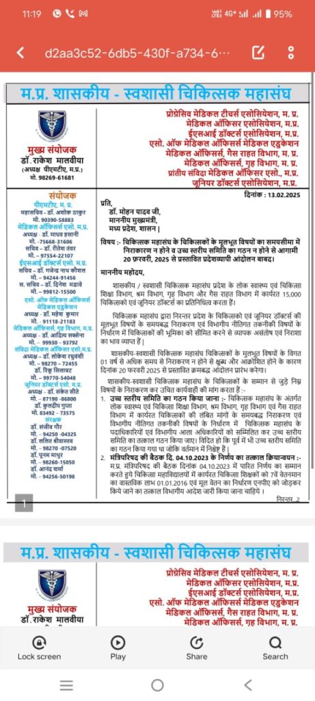 मध्य प्रदेश चिकित्सा महासंघ ने हड़ताल पर जाने का ऐलान किया है। 20 और 21 फरवरी को काली पट्टी बांधकर विरोध प्रदर्शन करेंगे। 22 फरवरी को आधे घंटे के लिए प्रदेशभर में इमरजेंसी छोड़कर डॉक्टर ड्यूटी नहीं करेंगे। वहीं 23, 24 और 25 फरवरी को डॉक्टर इमरजेंसी ड्यूटी करेंगे। मेडिकल ऑफिसर एसोसिएशन ने सरकार को चेतावनी भी दी है। उन्होंने कहा कि इसके बाद भी सरकार ने कोई सुनवाई नहीं की तो बड़े स्तर पर हड़ताल होगी।