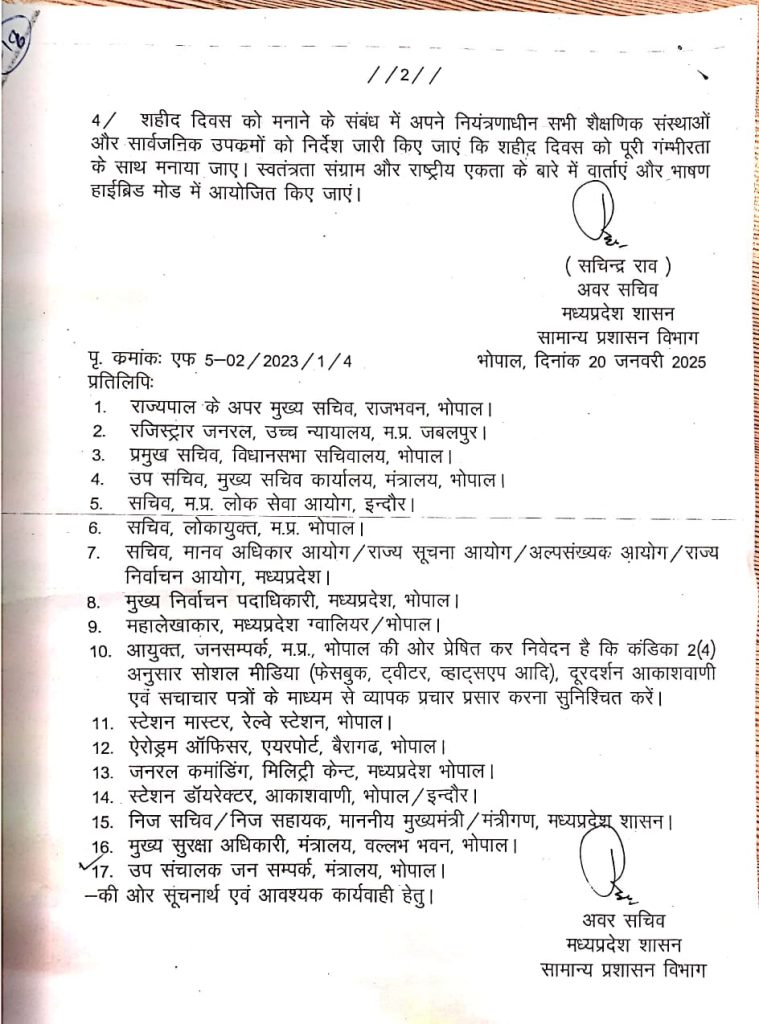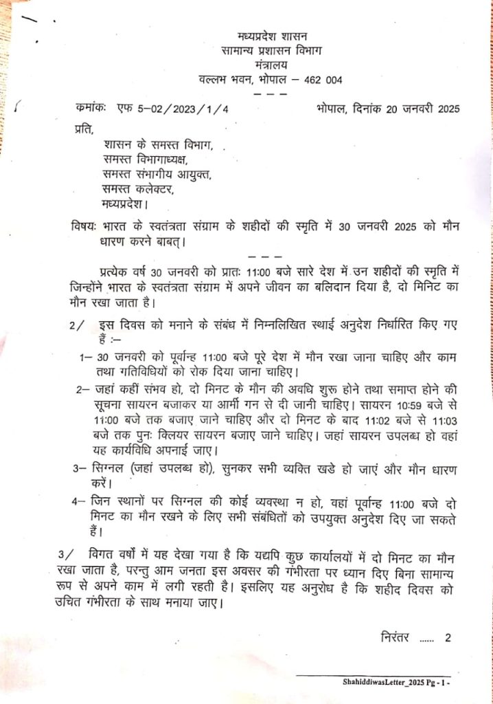 3- विगत वर्षों में यह देखा गया है कि यद्यपि कुछ कार्यालयों में दो मिनट का मौन रखा जाता है, परन्तु आम जनता इस अवसर की गंभीरता पर ध्यान दिए बिना सामान्य रूप से अपने काम में लगी रहती है। इसलिए यह अनुरोध है कि शहीद दिवस को उचित गंभीरता के साथ मनाया जाए।