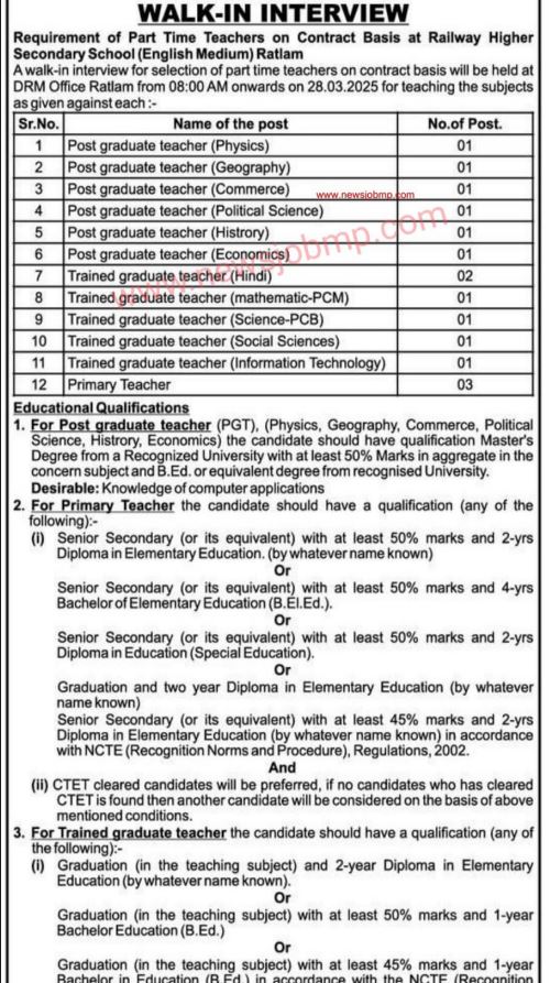 रेलवे शिक्षक भर्ती प्रक्रिया के अंतर्गत पीआरटी (PRT), टीजीटी (TGT) और पीजीटी (PGT) के पदों पर भर्ती निकली है। इन पदों के लिए साक्षात्कार 24, 25, 26 और 28 मार्च 2025 को आयोजित होगा। अभ्यर्थी का इंटरव्यू के आधार पर चयन किया जाएगा।