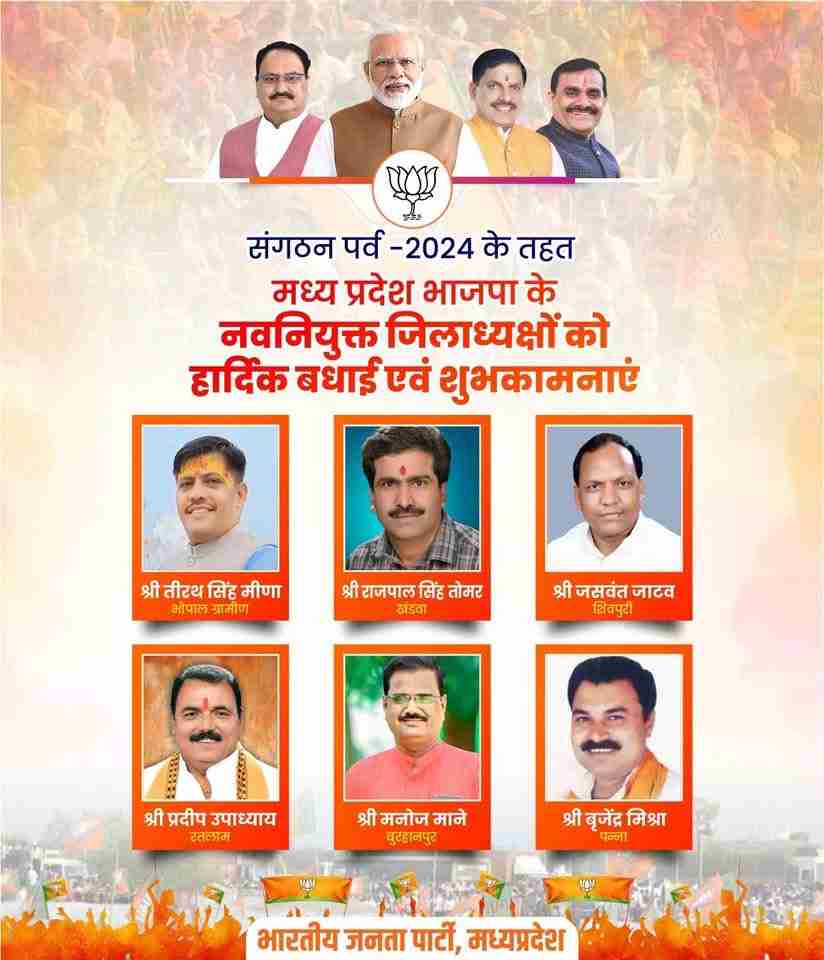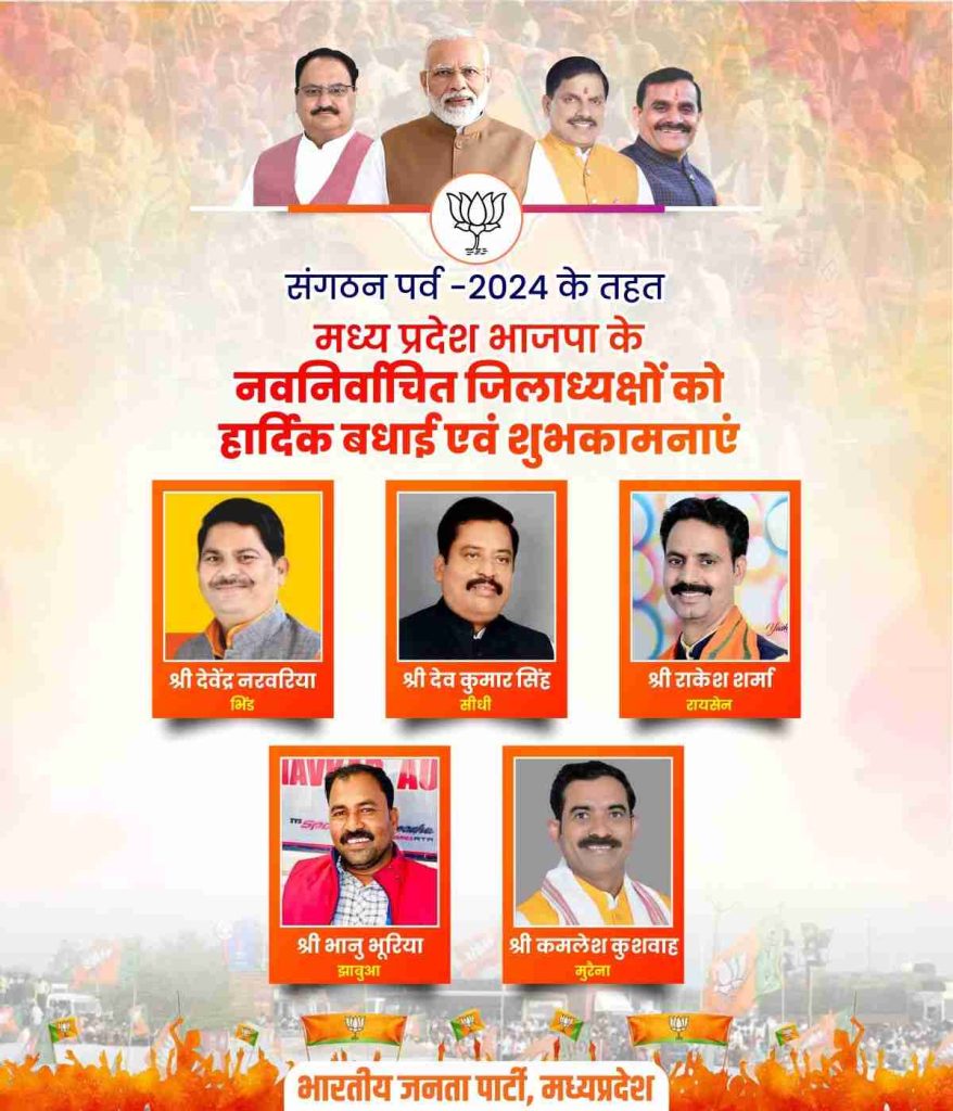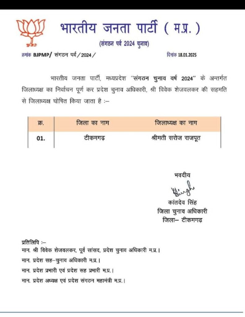 भोपाल। BJP District President: भाजपा ने आज जिला अध्यक्ष की एक लिस्ट जारी की है। टीकमगढ़ जिले से अध्यक्ष के नाम का ऐलान कर दिया गया है। पार्टी ने सरोज राजपूत को जिले की कमान सौंपी है। बता दें कि भाजपा ने 57 वां नाम जारी किया है। अब भी 5 जिला अध्यक्ष की घोषणा होनी बाकी है।