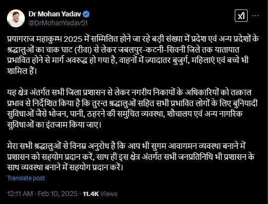 सीएम डॉ. मोहन यादव ने सोशल मीडिया प्लेटफॉर्म ‘एक्स’ पर पोस्ट किया, “प्रयागराज महाकुंभ 2025 में सम्मिलित होने जा रहे बड़ी संख्या में प्रदेश एवं अन्य प्रदेशों के श्रद्धालुओं का चाकघाट (रीवा) से लेकर जबलपुर-कटनी-सिवनी जिले तक यातायात प्रभावित होने से मार्ग अवरुद्ध हो गया है, वाहनों में ज्यादातर बुजुर्ग, महिलाएं एवं बच्चे भी शामिल हैं।”