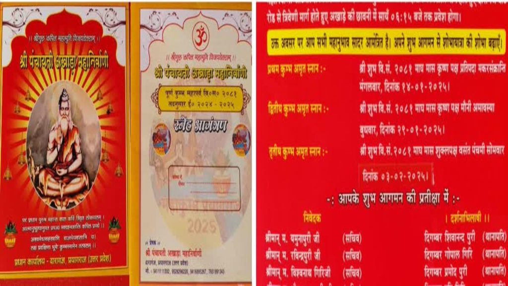 इस आमंत्रण पत्र में 2 जनवरी 2025 को कुंभ मेला छावनी प्रवेश शोभायात्रा (पेशवाई) और प्रथम कुंभ अमृत स्नान 14 जनवरी, द्वितीय कुंभ अमृत स्नान 29 जनवरी और तृतीय कुंभ अमृत स्नान 3 फरवरी लिखा हुआ है. साथ ही 6 दिसंबर को कुंभ छावनी भूमि पूजन और 22 दिसंबर को धर्मध्वजा मुहूर्त स्थापना की तारीख लिखी हुई है.