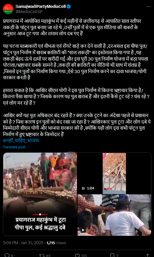 सपा मीडिया सेल ने X पर पोस्ट किया है कि ‘प्रयागराज में आयोजित महाकुंभ में कई महीनों से छत्तीसगढ़ से आयातित साल स्लीपर लकड़ी के पांटून पुल बनाए जा रहे थे. उन्हीं पुलों में से एक पुल मीडिया की खबरों के अनुसार आज टूट गया और तमाम लोग दब गए हैं. यह घटना स्तब्धकारी एवं वीभत्स एवं रोंगटे खड़े कर देने वाली है.’
