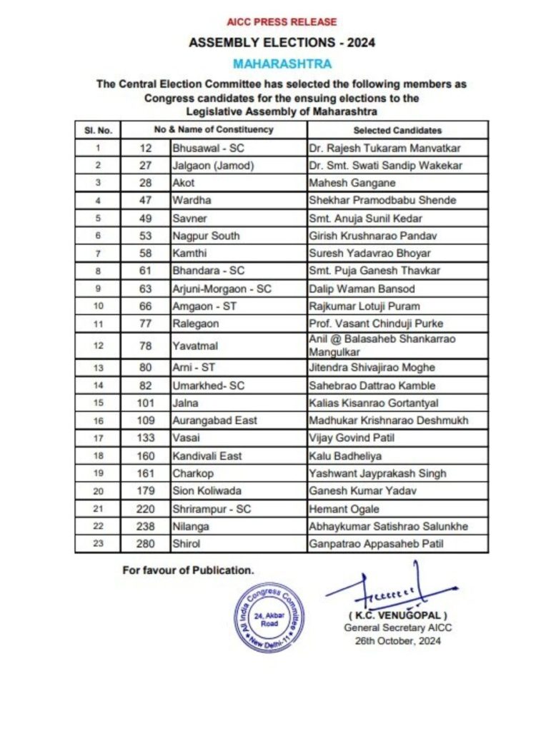 इस तरह महाराष्ट्र विधानसभा चुनाव के लिए कांग्रेस ने 71 उम्मीदवारों की घोषणा कर दी है। पहली लिस्ट में 48 और दूसरी लिस्ट में 23 उम्मीदवारों को टिकट दिया गया है। कांग्रेस ने नागपुर साउथ से गिरिश पांडव, वर्धा से शेखर शिंदे और यवतमाल से अनिल मांगुलकर को टिकट दिया है।